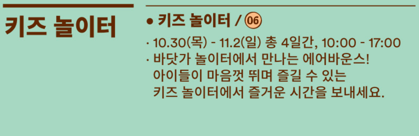 아이들을 위한 에어바운스가 설치된다는 것에 깜짝 놀랐습니다. 커피를 좋아하는 어른뿐 아니라 아이들도 정말 즐거운 시간을 보낼 수 있을 것 같습니다. 아이들을 위한 놀이터 이용 시간 확인하세요.